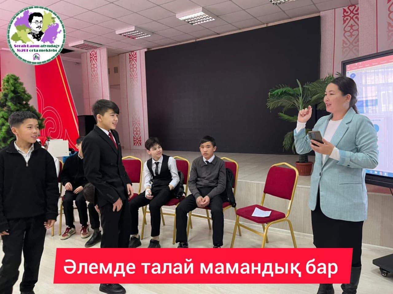 Мектебімізде "Әлемде талай мамандық бар" тақырыбында 9 - сынып оқушыларымен мамандық таңдау, олардың негізгі түрлері, классификациялық белгілері, мамандықтар тобы туралы білімдерін, түсініктерін кеңейту, мамандық таңдаудың қыр - сырларын меңгерту, кәсіптік бағдар беру мақсатында жоспарға сәйкес тренинг өткізілді.